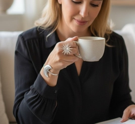Conjunto Noche clara plata chapado 10µ. Pulsera luna latón y anillo plata 10µ