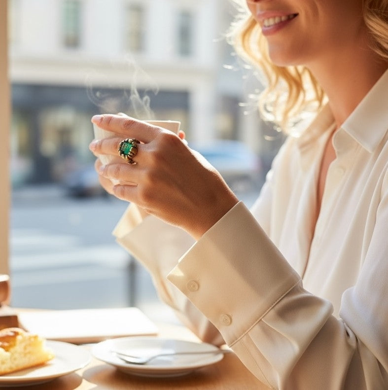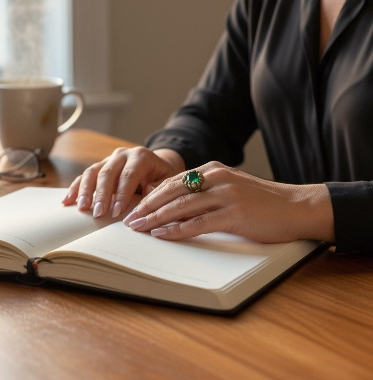 Anillo realizado en fundición de zamak chapado dorado-latón. Talla 14. Con detalle central de cristal sintético facetado en color verde esmeralda. Al tratarse de un artículo realizado a mano de modo artesanal, las medidas puedes variar en mm. Antialérgico y libre de materias dañinas como Nikel o Plomo. Diseño exclusivo Gloria Mago.Fabricado en España con materias primas de proximidad y de modo sostenible y artesano Se entrega con bolsa/etiqueta/caja o cartoncillo de la marca. El color puede variar ligeramente debido a las pantallas, la partida de fabricación o los tintes empleados si fuera el caso. Cumple todos los standares de calidad y seguridad de la UE. Se trata de piezas realizadas a mano por lo que cada opieza es única, y sus virtudes y defectos la hacen especial como aquel que la luce.Si se emplean pieles y cueros son ecológicos y provenientes de la industria alimentaria
