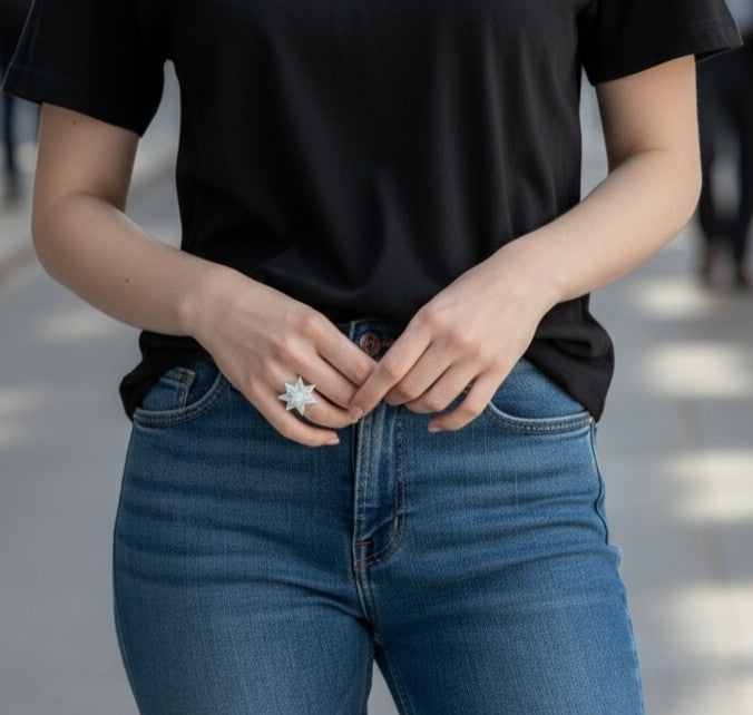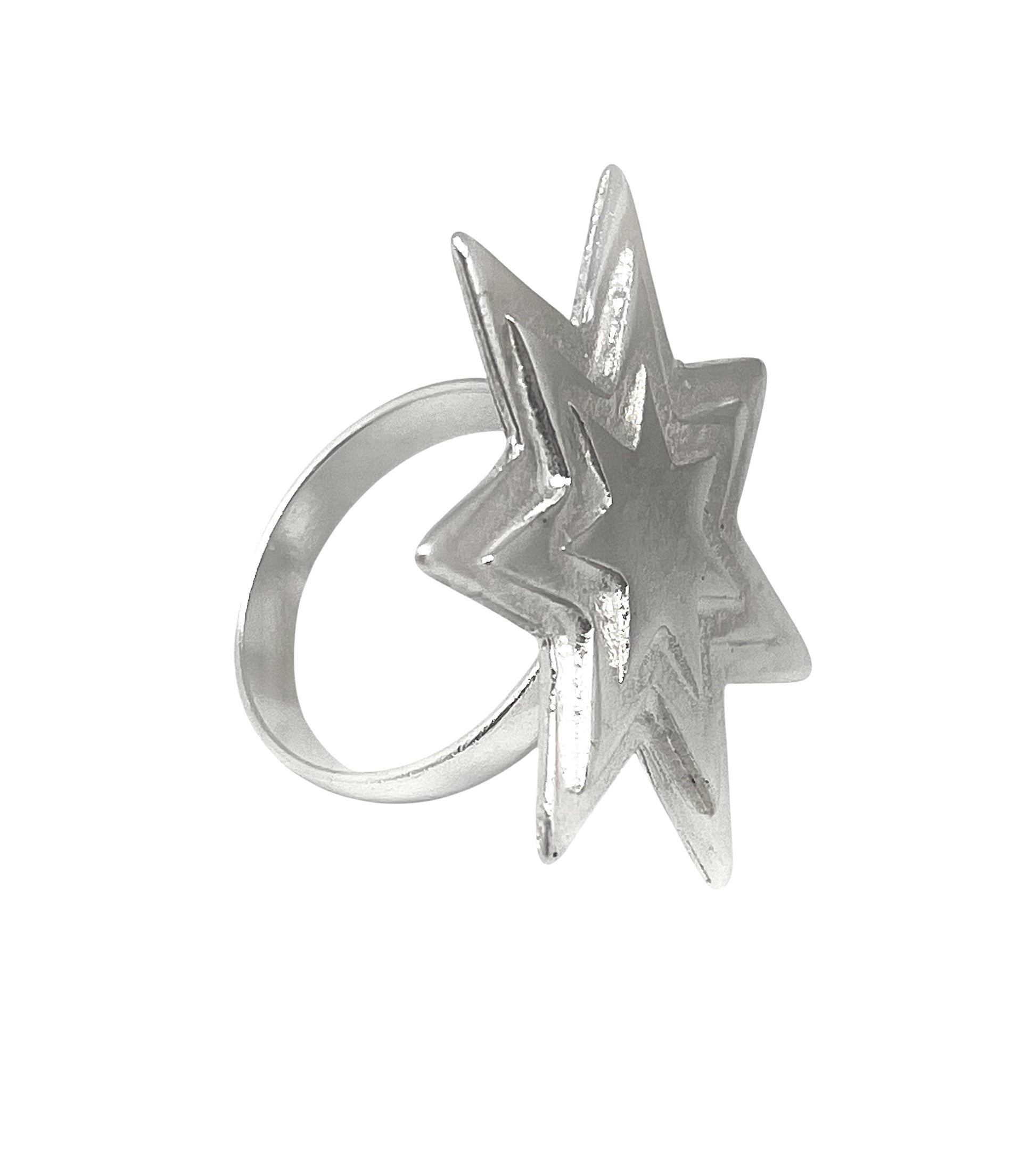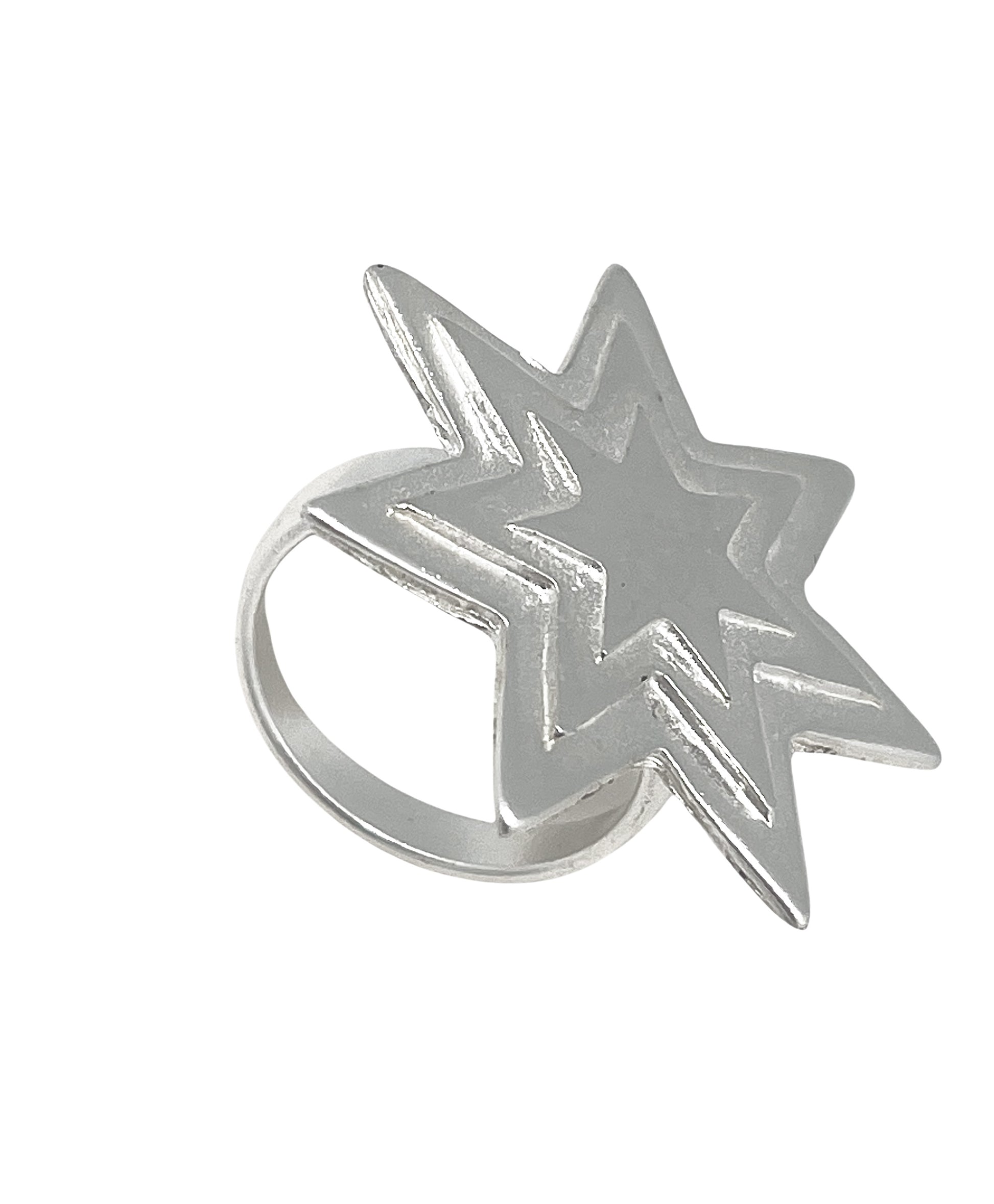 Anillo realizado en fundición de zamak chapado plata de ley 10µ y base de latón en talla13 chapado en plata de ley . Detalle de pieza en forma de estrella en alto relieve a 3 alturas. Al tratarse de un artículo realizado a mano de modo artesanal, las medidas puedes variar en mm. Antialérgico y libre de materias dañinas como Nikel o Plomo. Diseño exclusivo Gloria Mago.Fabricado en España con materias primas de proximidad y de modo sostenible y artesano Se entrega con bolsa/etiqueta/caja o cartoncillo de la marca. El color puede variar ligeramente debido a las pantallas, la partida de fabricación o los tintes empleados si fuera el caso. Cumple todos los standares de calidad y seguridad de la UE. Se trata de piezas realizadas a mano por lo que cada opieza es única, y sus virtudes y defectos la hacen especial como aquel que la luce.Si se emplean pieles y cueros son ecológicos y provenientes de la industria alimentaria