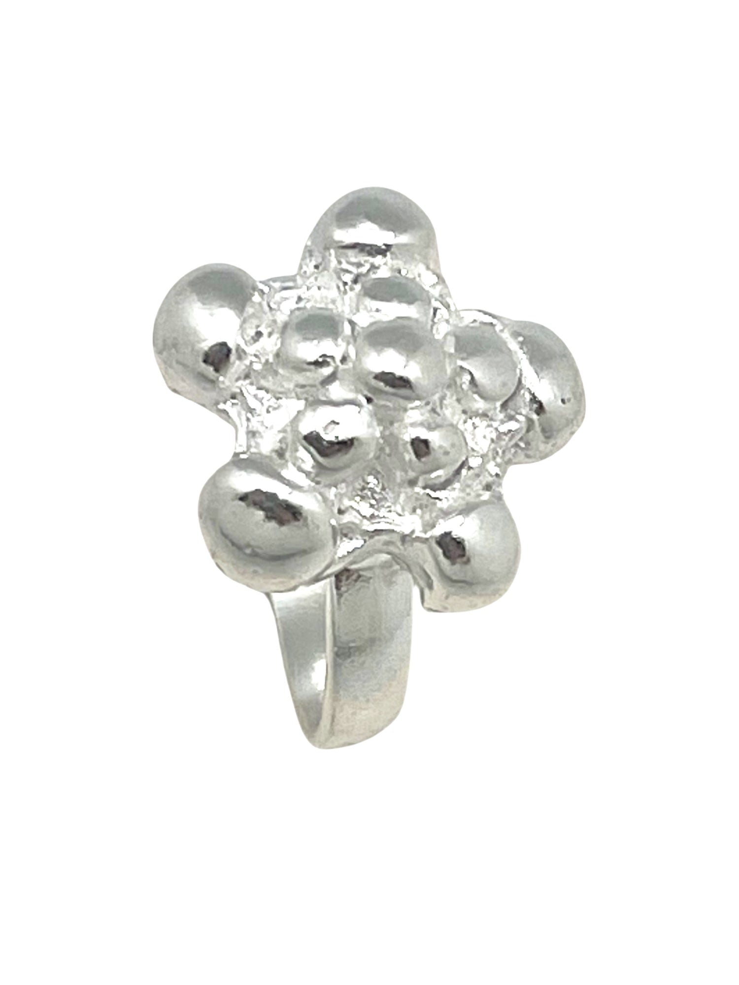 Anillo realizado en fundición de zamak chapado plata de ley 10µ  y base de latón en talla 14. Detalle de pieza en forma de uinión de bolitas formando un estilo flor .Al tratarse de un artículo realizado a mano de modo artesanal, las medidas puedes variar en mm. Antialérgico y libre de materias dañinas como Nikel o Plomo.  Diseño exclusivo Gloria Mago..Fabricado en España con materias primas de proximidad y de modo sostenible y artesano Se entrega con bolsa/etiqueta/caja o cartoncillo de la marca.  El color puede variar ligeramente debido a las pantallas, la partida de fabricación o los tintes empleados si fuera el caso. Cumple todos los standares de calidad y seguridad de la UE. Se trata de piezas realizadas a mano por lo que cada opieza es única, y sus virtudes y defectos la hacen especial como aquel que la luce.Si se emplean pieles y cueros son ecológicos y provenientes de la industria alimentaria