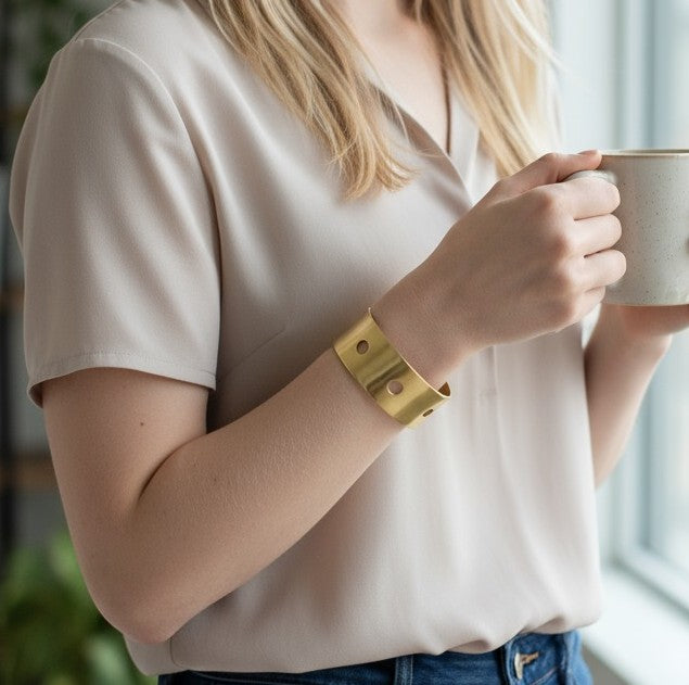 Brazalete pulsera ancha latón Camino dorado chapado Gloria Mago design