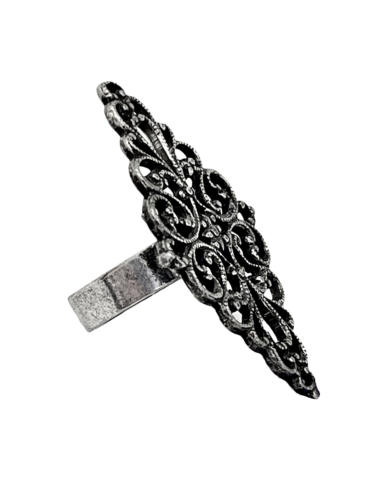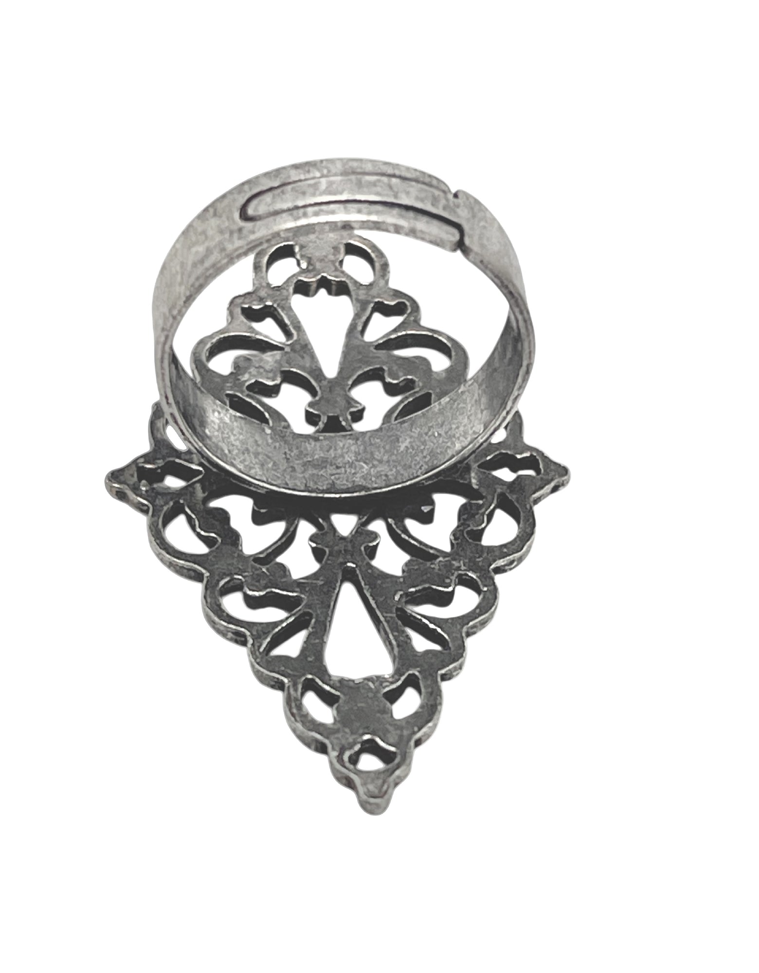 Anillo realizado en peltre o zamak chapado en plata de ley 10µ con patina de envejecido. Diseño vintage en forma de rombo calado. Anilloajstable con base se latón. Apertura en la parte de abajo. Antialérgico y libre de materias dañinas como Nikel o Plomo. Diseño exclusivo Gloria Mago..Fabricado en España con materias primas de proximidad y de modo sostenible y artesano Se entrega con bolsa/etiqueta/caja o cartoncillo de la marca. El color puede variar ligeramente debido a las pantallas, la partida de fabricación o los tintes empleados si fuera el caso. Cumple todos los standares de calidad y seguridad de la UE. Se trata de piezas realizadas a mano por lo que cada opieza es única, y sus virtudes y defectos la hacen especial como aquel que la luce.Si se emplean pieles y cueros son ecológicos y provenientes de la industria alimentaria
