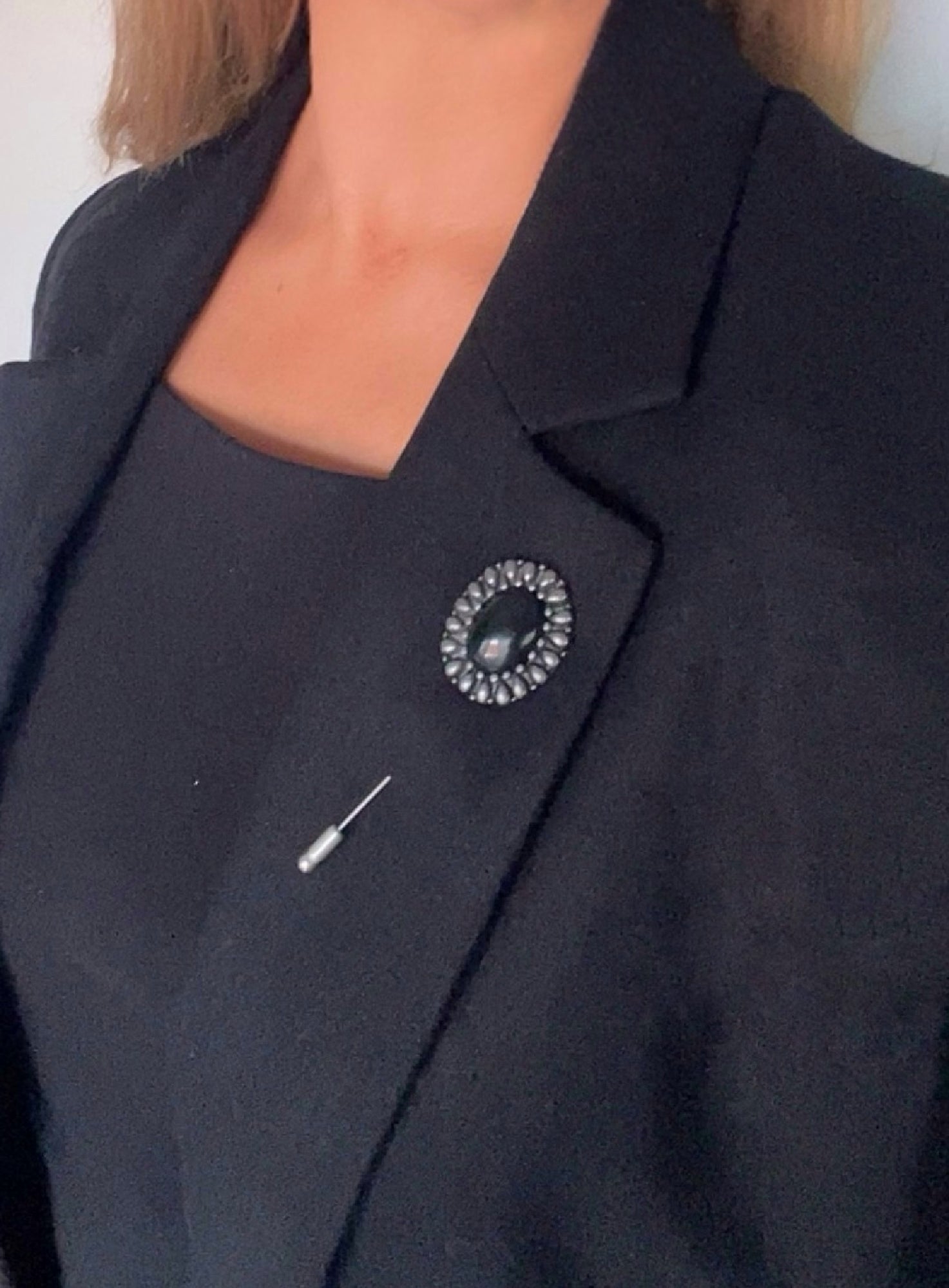 Broche tipo alfiler en metal de zamak o peltre chapado en plata de ley 10µ con pátina de envejecido para dar ambiente vintage y cristal en el centro en color negro. Idel para cualquier ocasión y prenda: Vestido, blazer, abrigo, etc. Antialérgico.Diseño exclusivo Gloria Mago..Fabricado en España con materias primas de proximidad y de modo sostenible y artesano Se entrega con bolsa/etiqueta/caja o cartoncillo de la marca. con materias primas de proximidad y de modo sostenible. Antialérgico. Se entrega con bolsa/etiqueta/caja o expositor de la marca. Los colores pueden variar debido a las resoluciones de las pantallas y/o filtros y a los tintes empleados en su caso. Cada pieza está terminada de modo artesanal, lo que la hace única, con sus virtudes y sus defectos, como aquel/la que la luce.
