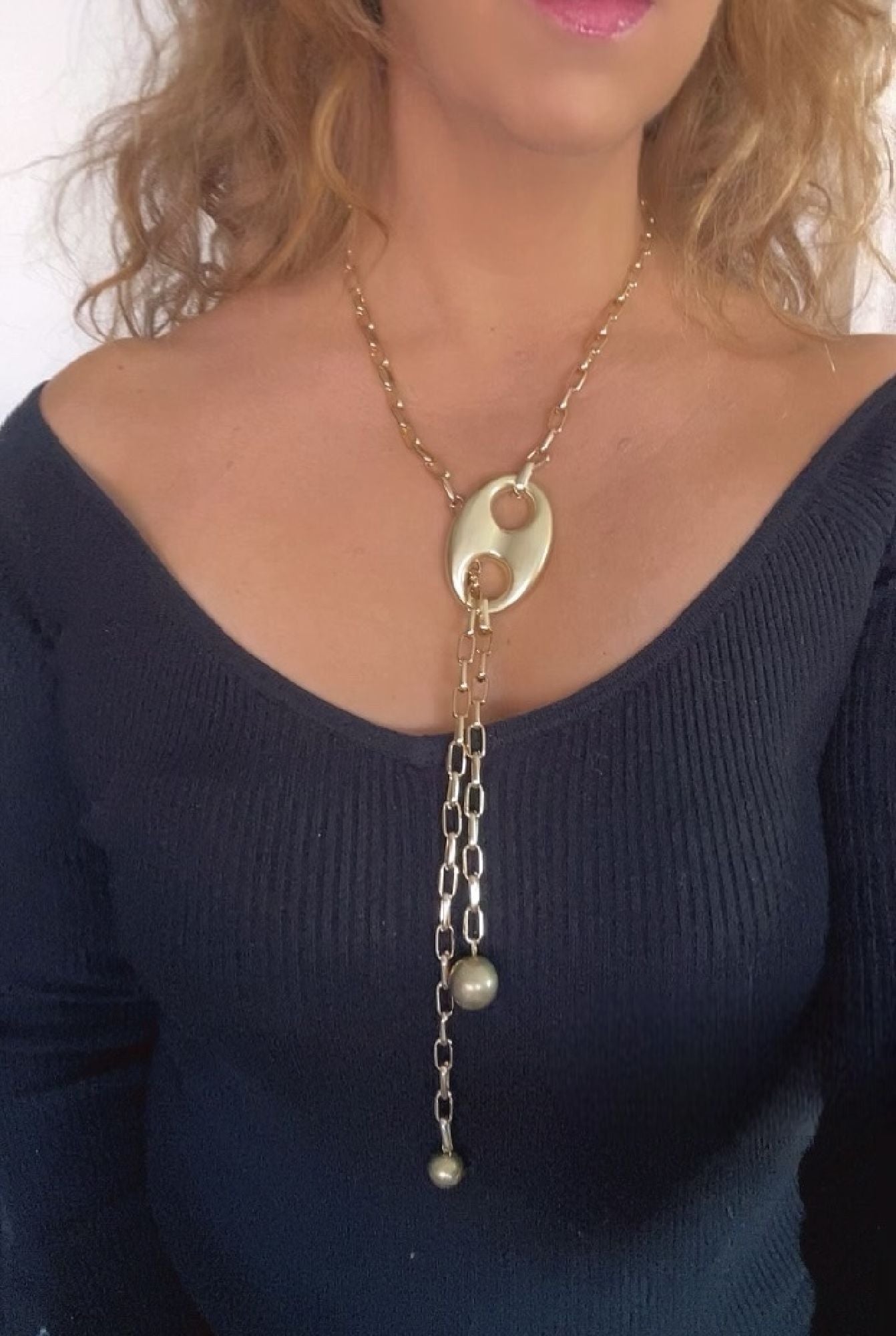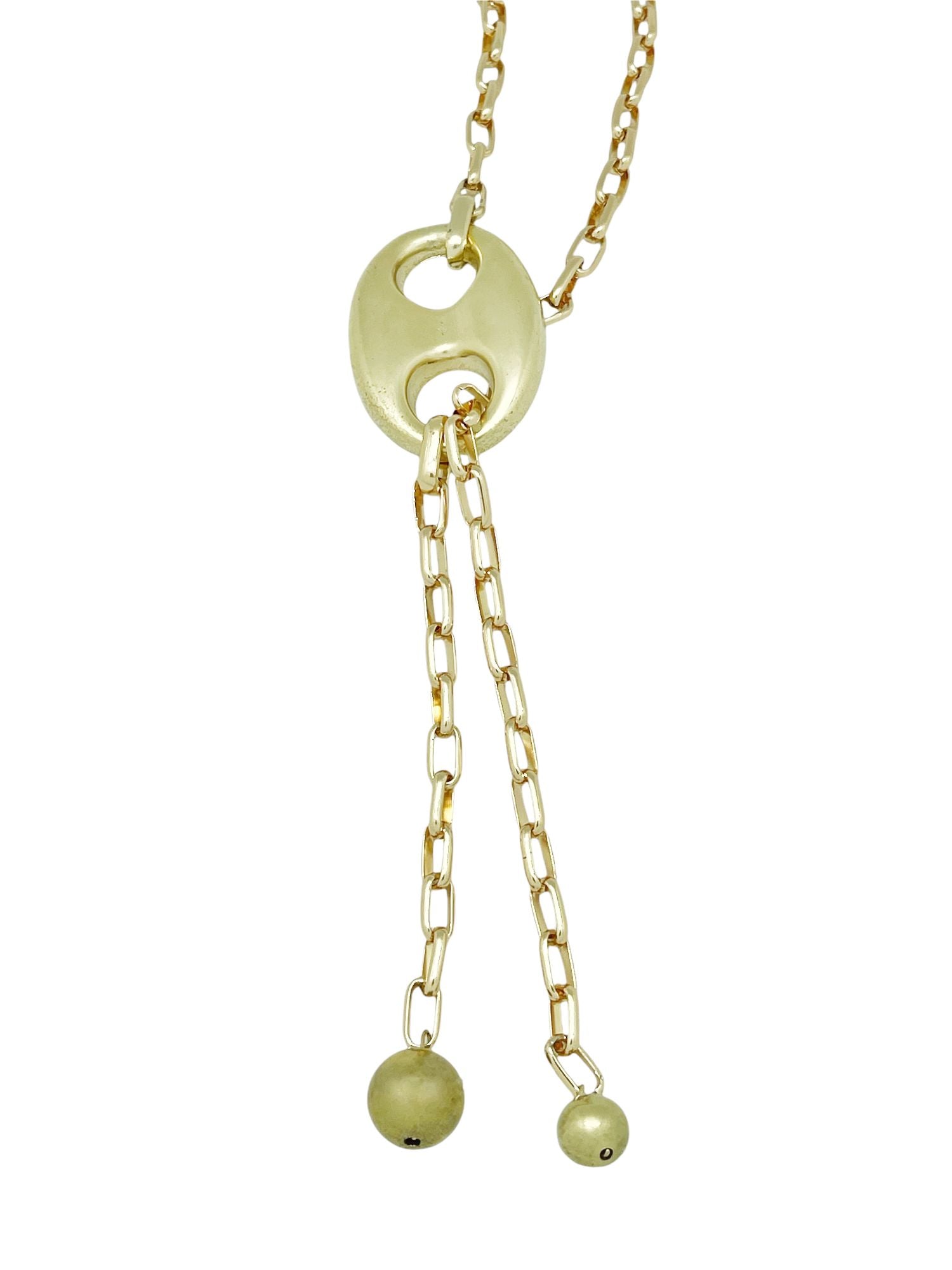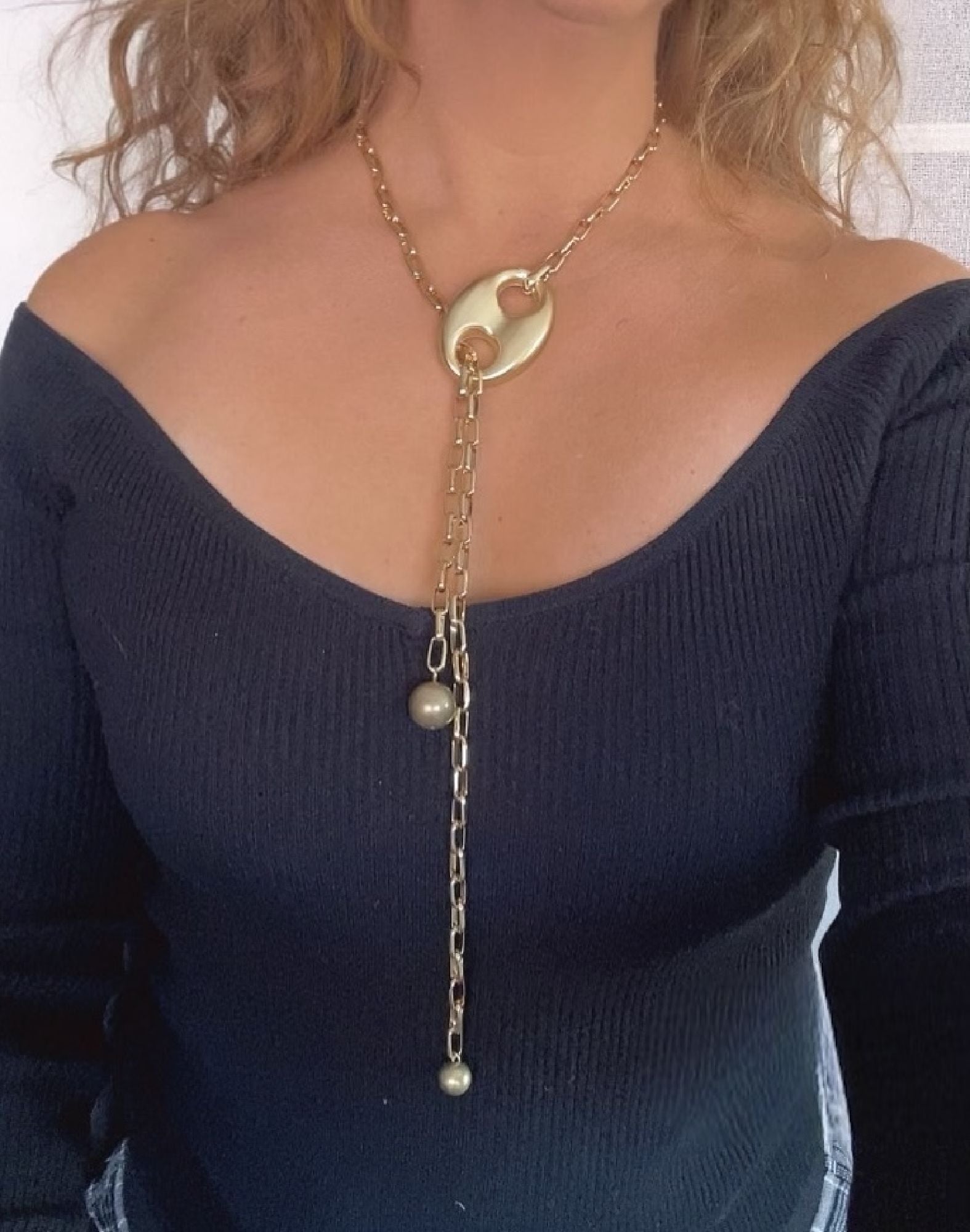 Collar a 75cm en cadena de aluminio chapado en dorado y pieza de calabrote de zamak chapado en dorado y bolas de CBS en dorado colgante. Ajustable distintas posiciones tipo corbatero. Antialérgico. Fabricado en España de modo artesanal,sostenible y con materias primas de proximidad. Diseño exclusivo Gloria Mago. Se entrega con expositor, etiqueta, bolsa o caja de la marca y etiqueta de cuidados. Los colores puden variar ligeramente debido a las resoluciones de las pantallas o a los tintes natirales empleados si fuera el caso.