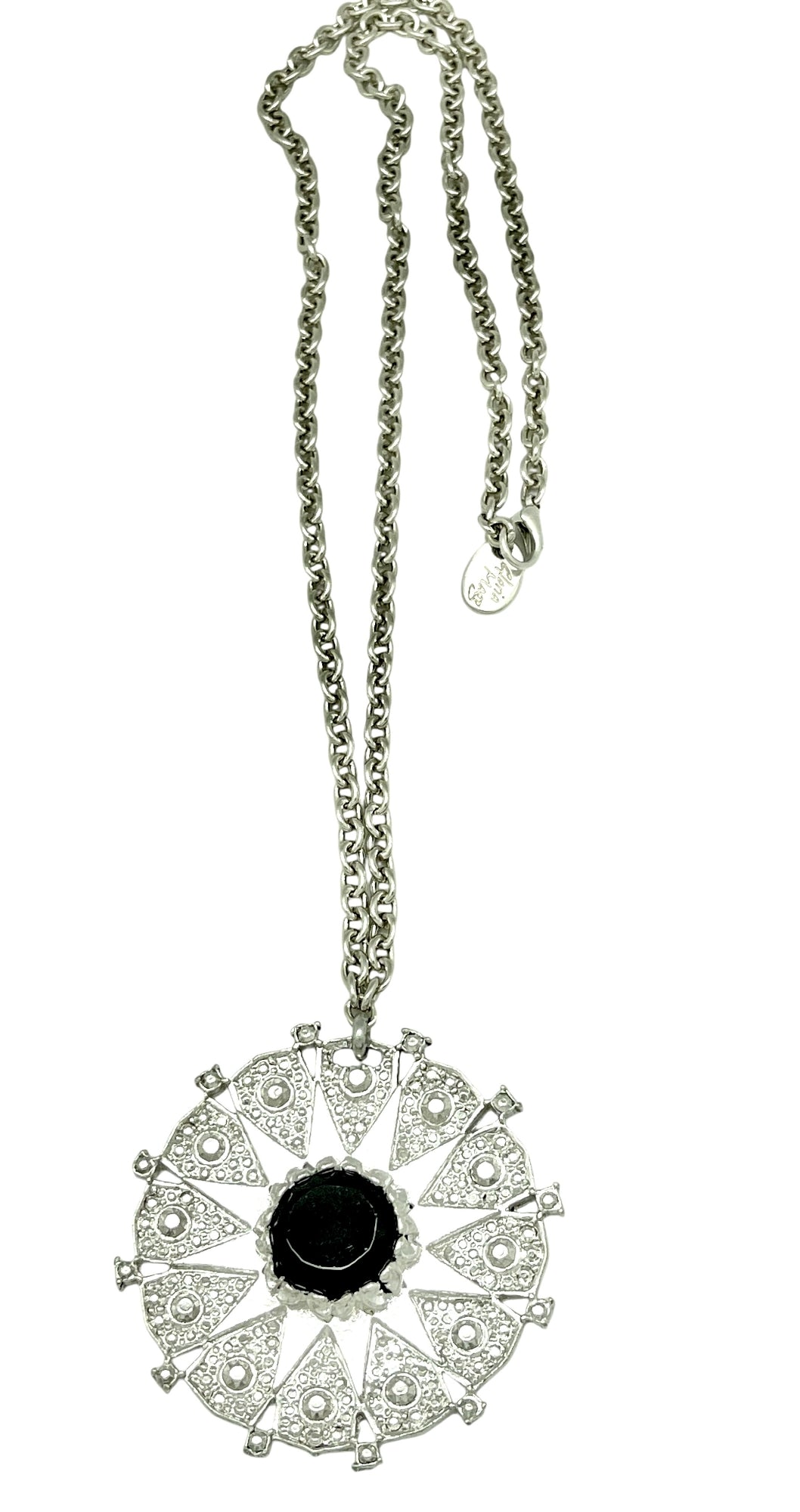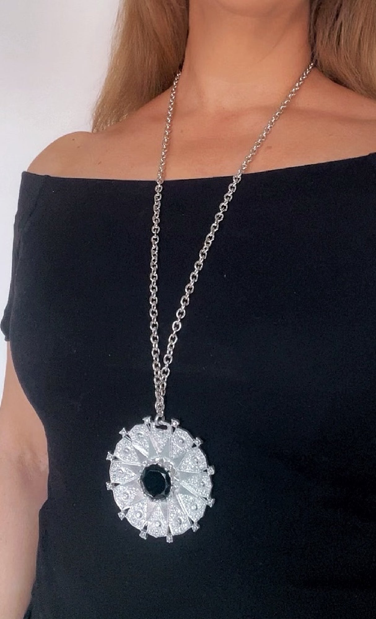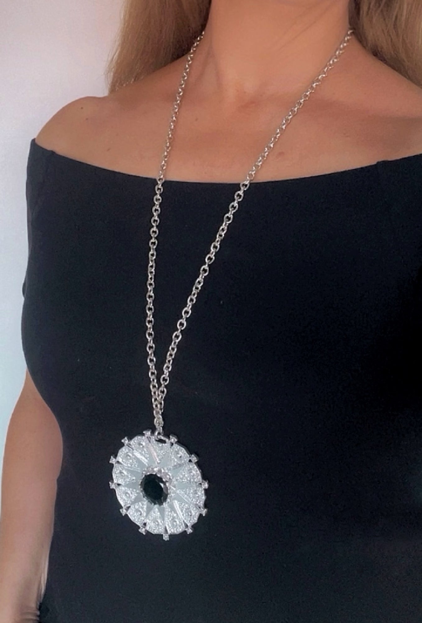 Collar lago en cadena de metal plateado en largo de 80cm con pieza central grande en función de zamak o peltre y chapada en plata de ley 10µ con pátina de envejecido para dar efecto vintage. Rematado en el centro con un cristal facetado de 20mm en color negro. Pieza única y exclusiva. Diseño exclusivo Gloria Mago.Fabricado en España con materias primas de proximidad y de modo sostenible y artesano Se entrega con expositor/bolsa/etiqueta o caja de la marca y cartoncillo de cuidados. El color puede variar ligeramente debido a las resolución de las pantallas y al uso de tintes ecológicos en su caso. Son piezas artesanales y acabadas a mano por lo cada una es única como aquel que la luce. LAs posible irregularidades son propias de las piezas artesanas y eso las hace más autenticas y especiales. Un Collar que hará que cualquier prenda se vea exclusiva y de calidad.