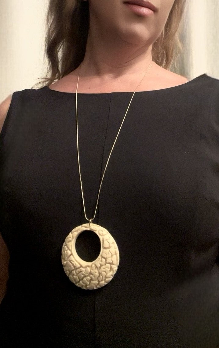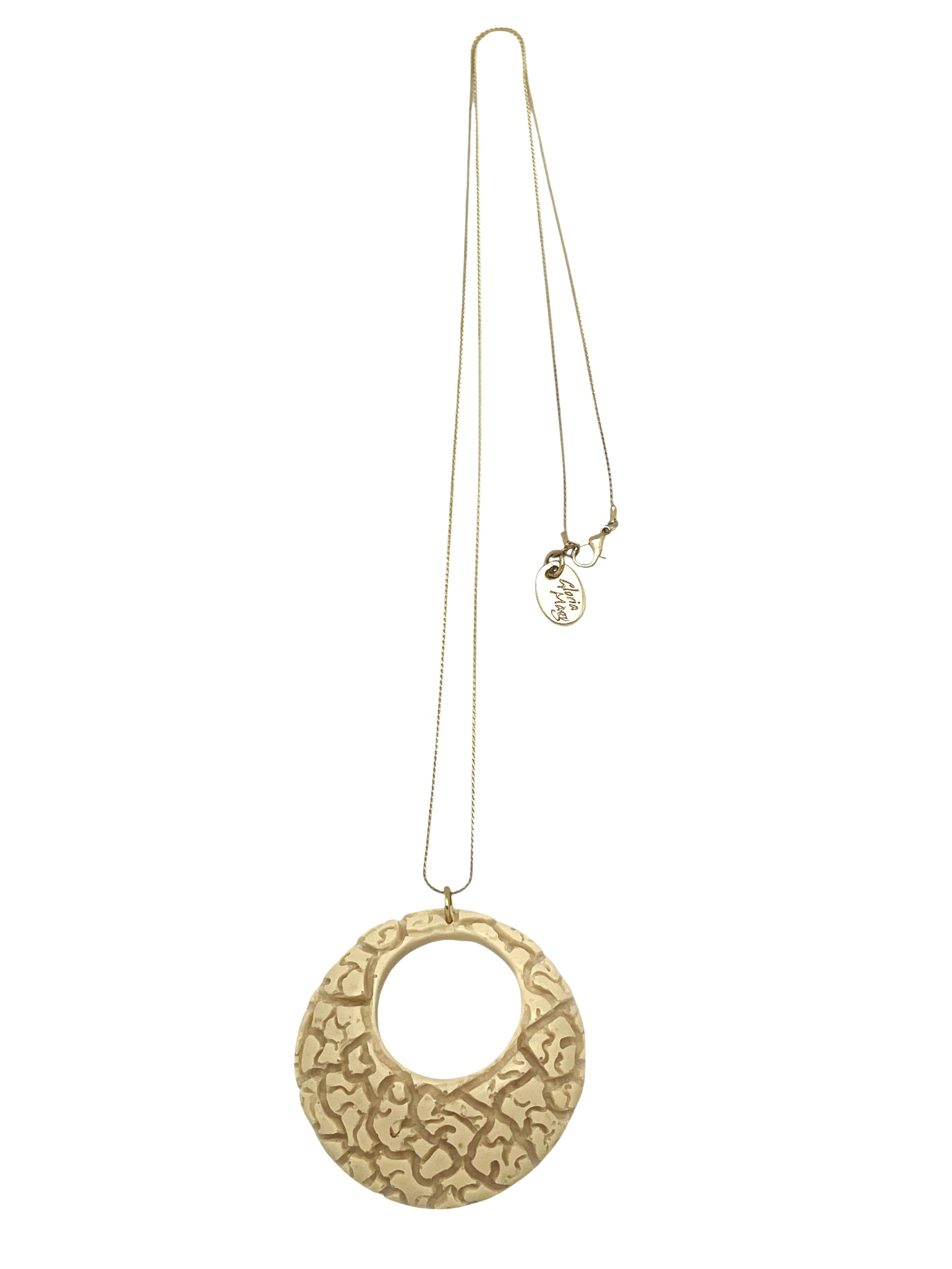 Collar largo de cadena de latón chapada en dorado estilo cola de ratón con un largo de 80cm sin contar el colgante. Con cierre de mosquetón.Collar largo con un colgante de diseño único y exclusivo de pieza de resina realizada a mano en forma de aro con ribetes interiores tipo laberinto en color blanco roto.Un diseño único y especial .Collar en tendencia pero atemporal. Un básico en tu joyero con toques exclusivos, elegantes pero casual, oficina, tardeo, en cualquier vento que te surja, resaltará cualquier look elegido.Antialérgico y libre de materias dañinas como Nikel o Plomo. Diseño exclusivo Gloria Mago.Fabricado en España con materias primas de proximidad y de modo sostenible y artesano Se entrega con bolsa/etiqueta/caja o cartoncillo de la marca. El color puede variar ligeramente debido a las pantallas, la partida de fabricación o los tintes empleados si fuera el caso. Cumple todos los standares de calidad y seguridad de la UE. Se trata de piezas realizadas a mano por lo que cada opieza es única, y sus virtudes y defectos la hacen especial como aquel que la luce.Si se emplean pieles y cueros son ecológicos y provenientes de la industria alimentaria