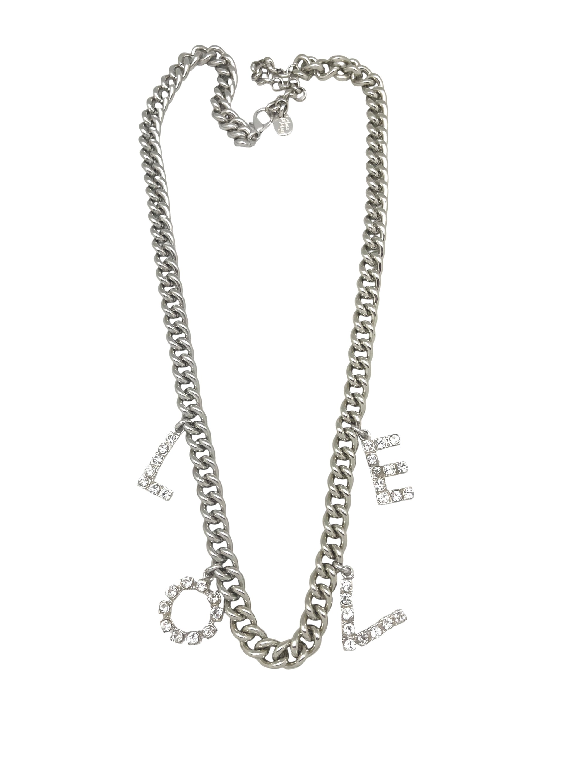 Collar largo en cadena de aluminio anonizado en plata ligero y farbricado en Italia con letras de zamak chapado en plata de ley 10µ y cuajados de cristales de Sw en color cristal formando la palabra LOVE en colgante irregular. Largo de 80cm. Cierre de mosquetón. Antialérgico y libre de materias dañinas como Nikel o Plomo.  Diseño exclusivo Gloria Mago..Fabricado en España con materias primas de proximidad y de modo sostenible y artesano Se entrega con bolsa/etiqueta/caja o cartoncillo de la marca.  El color puede variar ligeramente debido a las pantallas, la partida de fabricación o los tintes empleados si fuera el caso. Cumple todos los standares de calidad y seguridad de la UE. Se trata de piezas realizadas a mano por lo que cada opieza es única, y sus virtudes y defectos la hacen especial como aquel que la luce.