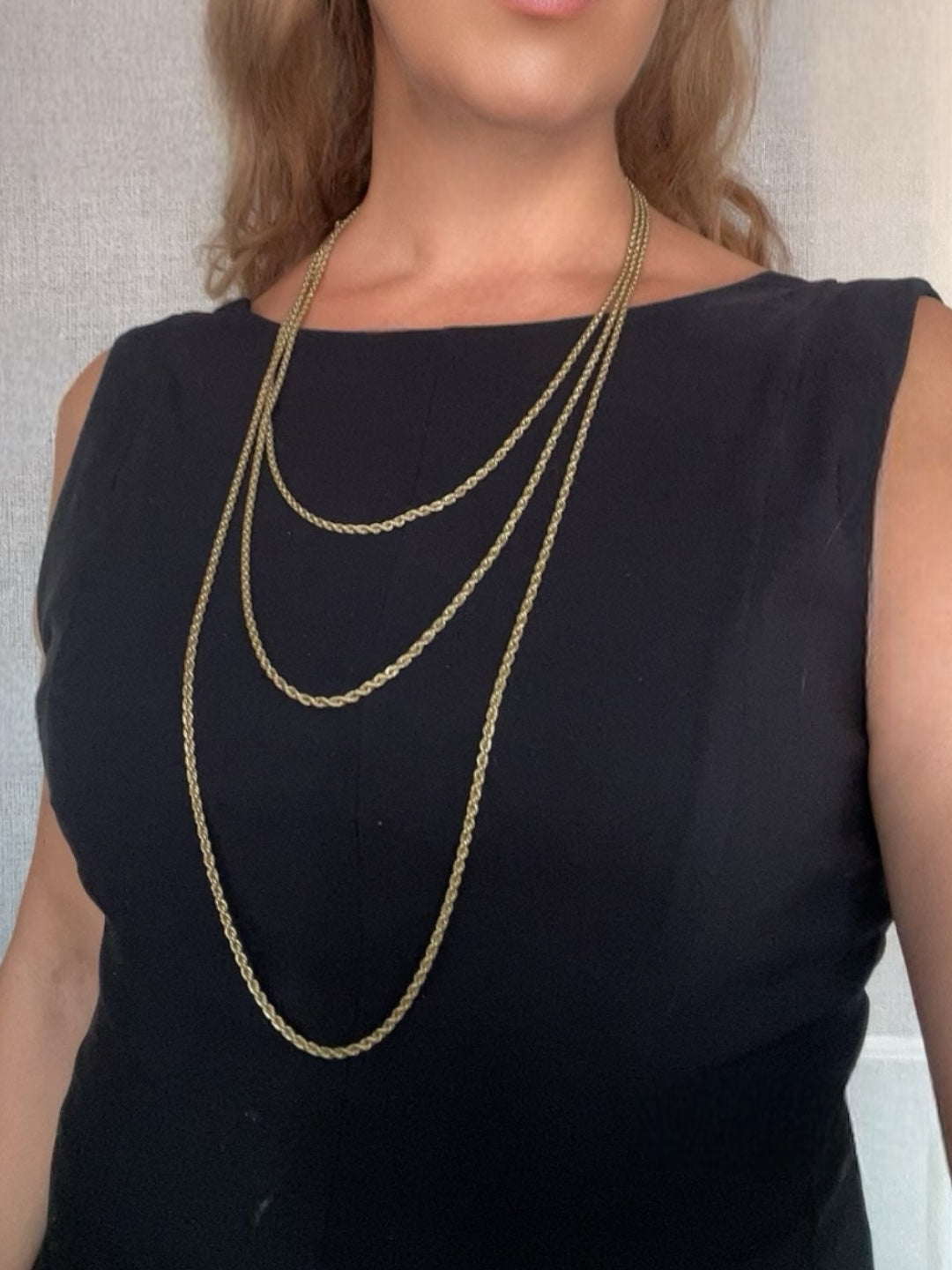 Collar largo en cadena de latón chapada en dorado (latón) y cierre de mosquetón. Son tres cadenas en un solo cierre largos de 60,75 y 95 cm.Cadena tipo cordón de estilo clásico pero actual. Idel apara llevar solo o acompañado de otros collares simples pendant. Collar en tendencia pero atemporal. Un básico en tu joyero. Antialérgico y libre de materias dañinas como Nikel o Plomo. Diseño exclusivo Gloria Mago..Fabricado en España con materias primas de proximidad y de modo sostenible y artesano Se entrega con bolsa/etiqueta/caja o cartoncillo de la marca. El color puede variar ligeramente debido a las pantallas, la partida de fabricación o los tintes empleados si fuera el caso. Cumple todos los standares de calidad y seguridad de la UE. Se trata de piezas realizadas a mano por lo que cada opieza es única, y sus virtudes y defectos la hacen especial como aquel que la luce.Si se emplean pieles y cueros son ecológicos y provenientes de la industria alimentaria