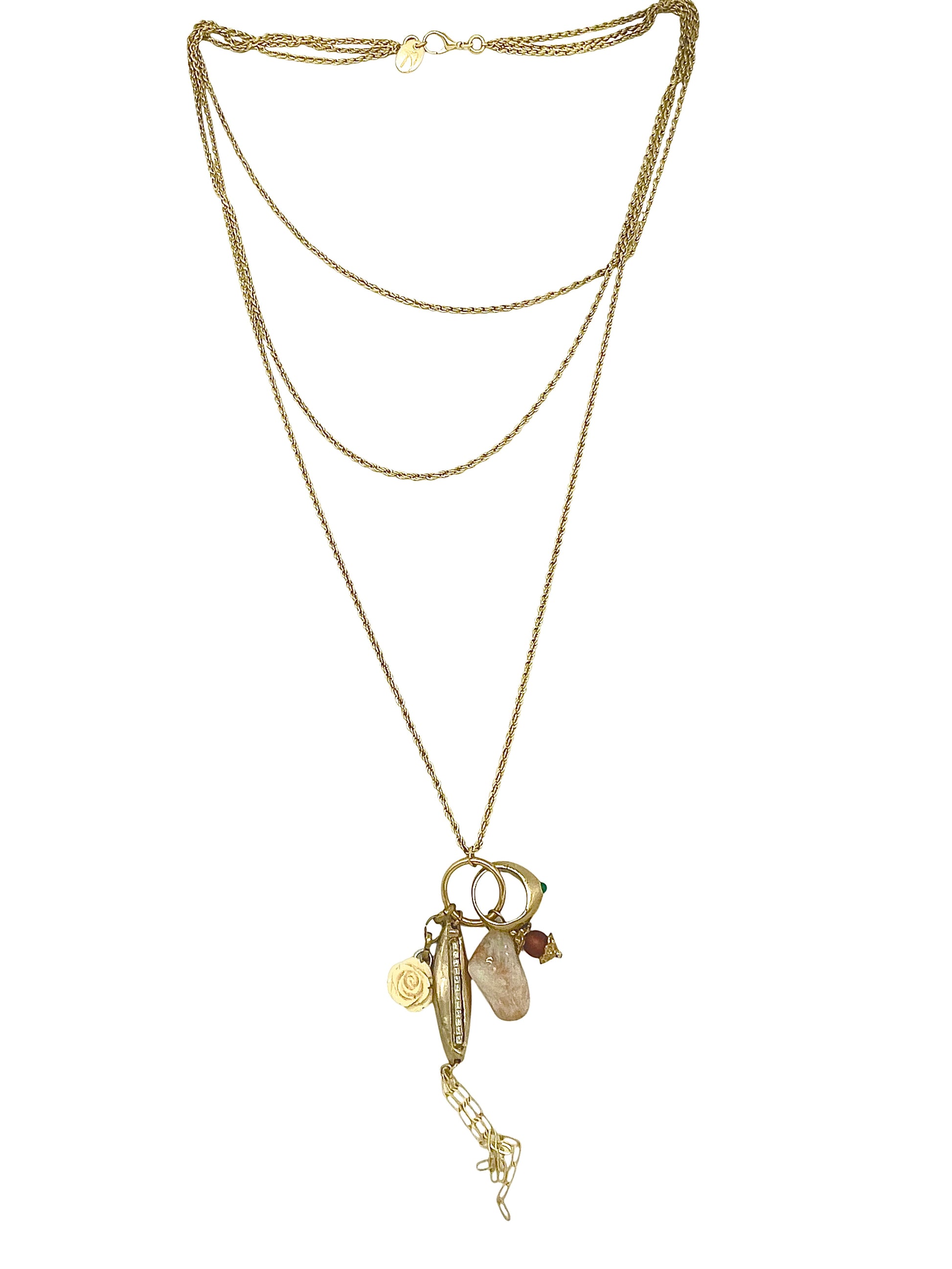 Collar largo de 3 cadenas de latón chapadas en dorado (latón) y cierre de mosquetón. Son tres cadenas en un solo cierre largos de 60,75 y 95 cm.Cadena tipo cordón de estilo clásico pero actual. En la cadena más larga cuelga un aro de charms diversos con toques misticos (anillo-citrilo-rosa de resina-bolas-cristales Sw, etc) . Collar en tendencia pero atemporal. Un básico en tu joyero. Antialérgico y libre de materias dañinas como Nikel o Plomo. Diseño exclusivo Gloria Mago..Fabricado en España con materias primas de proximidad y de modo sostenible y artesano Se entrega con bolsa/etiqueta/caja o cartoncillo de la marca. El color puede variar ligeramente debido a las pantallas, la partida de fabricación o los tintes empleados si fuera el caso. Cumple todos los standares de calidad y seguridad de la UE. Se trata de piezas realizadas a mano por lo que cada opieza es única, y sus virtudes y defectos la hacen especial como aquel que la luce.Si se emplean pieles y cueros son ecológicos y provenientes de la industria alimentaria