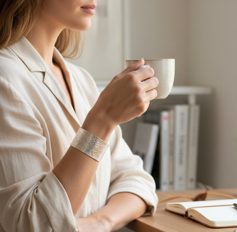 Pulsera brazalete en latón chapado en plata de ley 999 7-10 micras. Ajustable. Diseño exclusivo . Diseño exclusivo Gloria Mago.Fabricado en España con materias primas de proximidad y de modo sostenible y artesano Se entrega con bolsa/etiqueta/caja o cartoncillo de la marca. de modo artesanal y sostenible. Los dibujos de la pulsera se realizan de modo manual de uno en uno, por lo que no hay dos pulseras iguales. El detalle será lo más aproximado a la imagen mostrada. Modelo ajustable tipo brazalete. Se entrega con etiqueta , bolsa o caja de la marca.