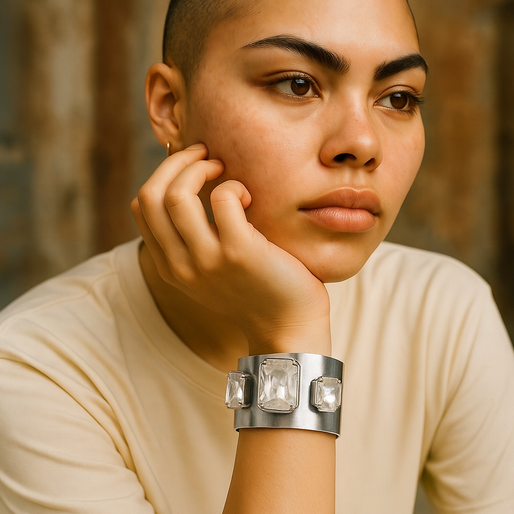 Brazalete en latón ancho chapado plata de ley 10µ y cristales sintéticos en color cristal engarzados en el centro. Ideal para cualquier oasión , casual o evento. Ajustable . Antialérgico y libre de materias dañinas como Nikel o Plomo.  Diseño exclusivo Gloria Mago.Fabricado en España con materias primas de proximidad y de modo sostenible y artesano Se entrega con bolsa/etiqueta/caja o cartoncillo de la marca.  El color puede variar ligeramente debido a las pantallas, la partida de fabricación o los tintes empleados si fuera el caso. Cumple todos los standares de calidad y seguridad de la UE. Se trata de piezas realizadas a mano por lo que cada opieza es única, y sus virtudes y defectos la hacen especial como aquel que la luce.Si se emplean pieles y cueros son ecológicos y provenientes de la industria alimentaria